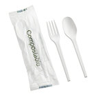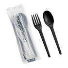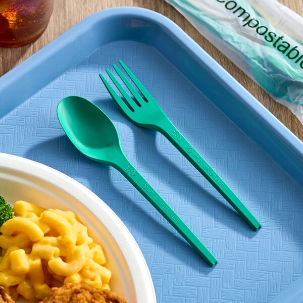 This EcoChoice wrapped heavy weight 6 1/2" green CPLA spoon and fork kit is a more sustainable option for disposable cutlery! An ideal alternative to traditional, petroleum-based plastic utensils, the cutlery is made of CPLA, a plant- and chalk-based plastic that's formed with renewable resources to minimize environmental impact upon disposal. CPLA (crystalized PLA) is stronger and can withstand temperatures than standard PLA, ranging from -4 to 212 degrees Fahrenheit, resulting in a sturdier utensil.