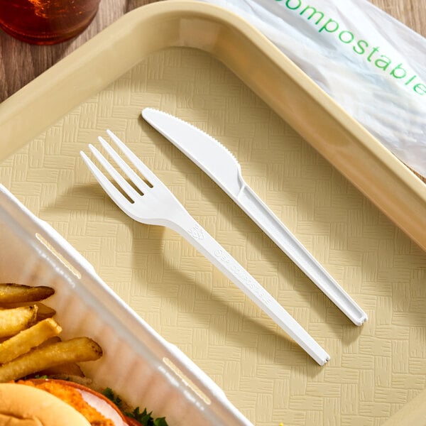 This EcoChoice wrapped heavy weight compostable 6 1/2" white CPLA knife and fork kit is a more sustainable option for disposable cutlery! An ideal alternative to traditional, petroleum-based plastic utensils, the cutlery is made of CPLA, a plant- and chalk-based plastic that's formed with renewable resources to minimize environmental impact upon disposal. CPLA (crystalized PLA) is stronger and can withstand temperatures than standard PLA, ranging from -4 to 212 degrees Fahrenheit, resulting in a sturdier utensil.