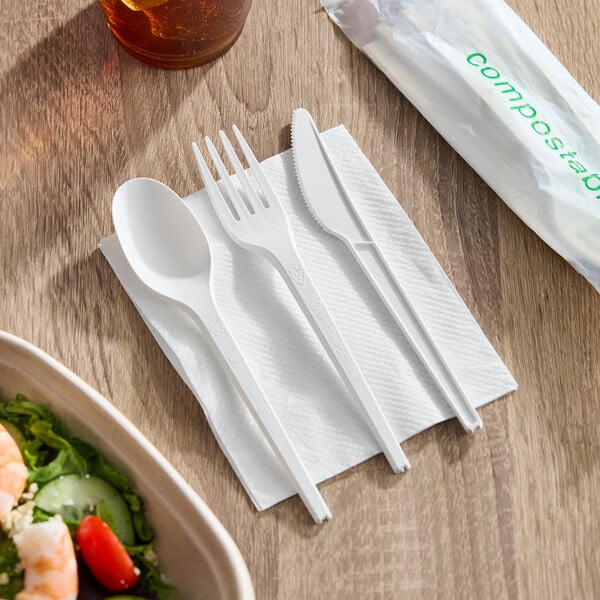 Offering a more sustainable option for disposable cutlery, these EcoChoice wrapped kits include a heavy weight compostable 6 1/2" white knife, fork, spoon, and napkin. An ideal alternative to traditional, petroleum-based plastic utensils, the cutlery is BPI certified and made of CPLA (crystalized polylactic acid), a plant- and chalk-based plastic that's formed with renewable resources to minimize environmental impact upon disposal.