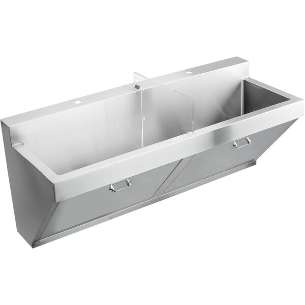 This Zurn Elkay EWSF260262 stainless steel wall hung double bowl surgeon scrub sink is a versatile addition to any hospital or healthcare facility! The one-piece, wall hung design is easily installed to save space and provide the most hygienic solution for your facility or business. The 3 1/2" drain is quick and efficient, while the 4" high backsplash prevents staining or damage to the attached wall.