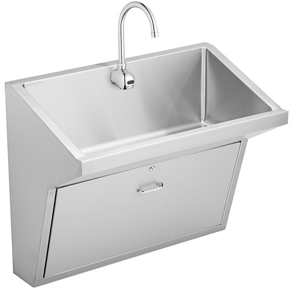This Zurn Elkay EWSFAD13620SACC stainless steel wall hung single bowl ADA surgeon scrub sink kit is a versatile addition to any hospital or healthcare facility! This all-inclusive kit is a one-stop shop that will have your business or facility equipped with a hygienic sink in no time. The one-piece, wall hung design is easily installed to save space. The kit also includes a 3 1/2" drain, a mixing valve to regulate temperature, and a sensor faucet. The full size backsplash prevents staining or damage to the attached wall.