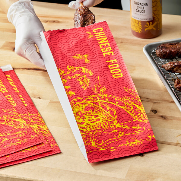 This quart-sized bag is ideal for holding large portions of egg rolls and side dishes, and is even large enough to hold half of a chicken for transport. Whether you need basic take-out bags at your Chinese restaurant or you are hosting a Chinese-themed event or stand, this foil bag is a great addition to capture guests' attention.