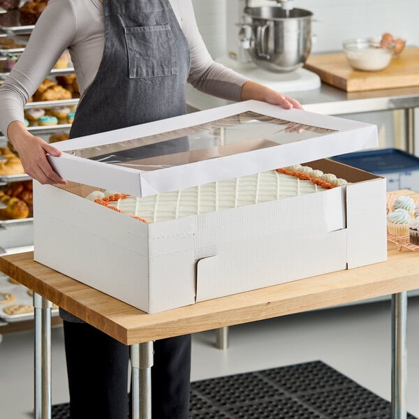 Package and transport your tiered and tall cakes with this versatile Enjay Flexbox+ white adjustable cake / bakery box. This box is designed with perforated sides that are easy to remove, so you can adjust the height to perfectly accommodate your full-size sheet cakes and other specialty desserts. Leave it as-is for a 8" height, or tear at the applicable perforation line to get a 5" or 6 1/2" high box! This feature is exclusive to the Flexbox+ line from Enjay, so you can be sure you are getting the best product with the most flexibility for your business.