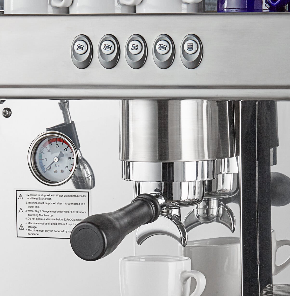 This BSPT threaded espresso machine includes 1 single portafilter and 1 double portafilter for superior versatility and has 5" of clearance between the grate and portafilter to accommodate a variety of cups. Built with four easily programmed settings, its durable construction, accessories such as a steam wand and a hot water outlet, and automatic cleaning functions make it the perfect addition to any coffee shop, cafe, or restaurant.