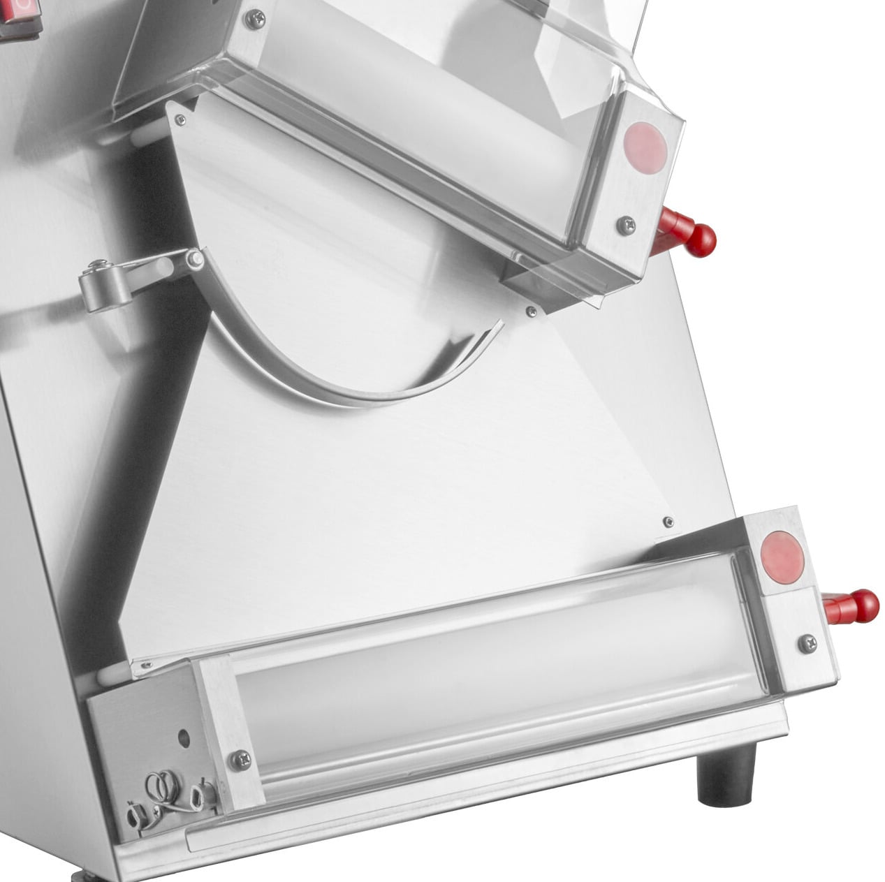 Thanks to its weighted catch arm, this unit effortlessly guides the dough from the 10 1/2" top roller into the 12" bottom roller, ensuring a consistent, uniformly rolled sheet. With this two stage design, you can run the dough through the machine fewer times for a consistent product and time savings.