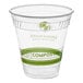 This cup's crystal-clear plastic construction provides complete product visibility, enhancing the appeal of your lemonades and smoothies and increasing impulse sales. It has a temperature tolerance between 40 and 105 degrees Fahrenheit, so it can be used in a variety of environments and weather conditions. Featuring a rolled rim for a leak-resistant snap-fit lid application, this cup creates a tight seal when used with compatible lids (sold separately), reducing accidental spills and leaking! This cup comes printed with a Greenware design, which makes your customers aware of its compostable material, as well as your commitment to providing an environmentally friendly product. Commit to going green in your establishment by providing drinks, parfaits, smoothies, and snacks in this compostable cup!