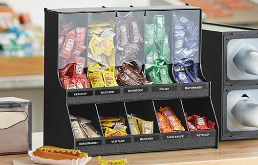 Clearly display and organize condiments, sauces, and seasonings in an easy-to-recognize way using condiment holders and dispensers.