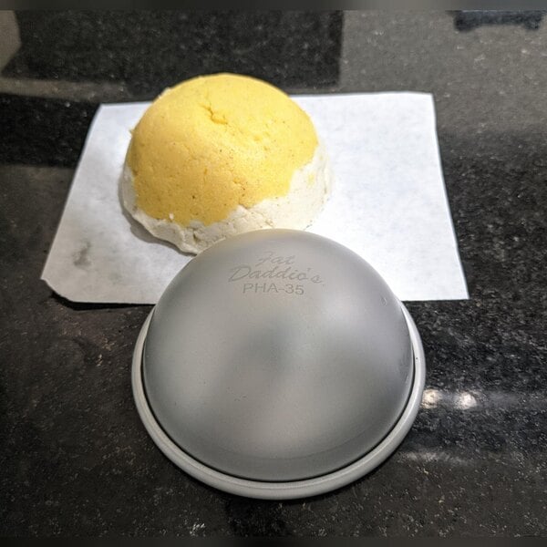 Bake creative cakes to perfection with this Fat Daddio's PHA-35 ProSeries 3 1/2" x 1 3/4" hemisphere anodized aluminum cake pan / mold. Made of sturdy 16-gauge anodized aluminum, this product is built bakery tough to endure the demands of continuous heavy-duty use in your bakery. By reflecting heat rather than absorbing it, ProSeries cake pans reach baking temperatures quickly. Even heating allows for the best possible rise and once out of the oven, they cool quickly and prevent dry, overbaked cakes.