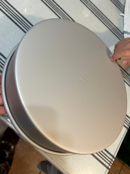 This is perfect for baking the top tiers of my cakes. The outside has a matte finish and the pan is very lightweight, which is helpful when moving it all over the kitchen.