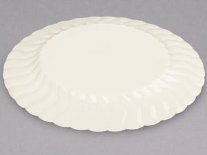 With it's scalloped edges and classic, bone/ ivory color, use this Fineline Flairware 210-BO 10 1/4" bone / ivory plastic plate to add style and sophistication to your special event, party, or banquet. This strong and sturdy plate is perfect for your restaurant, cafe, or catering service. It's elegant design adds a unique flair to main entrees and gourmet appetizers, making it the perfect backdrop for a variety of occasions.