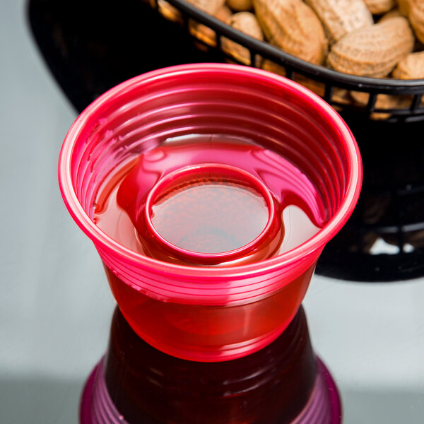 Add these Fineline Quenchers 4112-RD neon red blaster bomb shot cups to the nightlife at your bar, and let the fun explode! Their unique 2-chamber design saves you time and is made specifically for drop-in mixed drinks like Jager Bombs, Cherry Bombs, Melon Bombs and Tick Tacks. The cups separate the two liquids with a 1 oz. inner "shot" to hold the alcohol, and a 2.75 oz. outer chamber to hold the other liquid. As the bomb shot is tipped while drinking, the two chambers mix in a burst of flavor!
