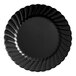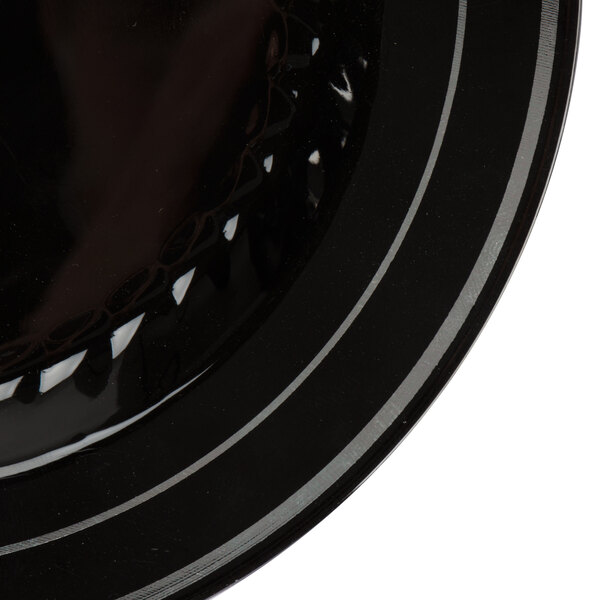 Made of heavy weight plastic, this strong and sturdy Fineline Silver Splendor 506-BKG 6" black plastic plate is perfect for wedding receptions and luncheons. It's great for serving desserts and appetizers, adding style and class to any tabletop. Plus, it's embellished with two silver bands to give it a distinct style that combines the convenience of plastic with the elegant appeal of china.