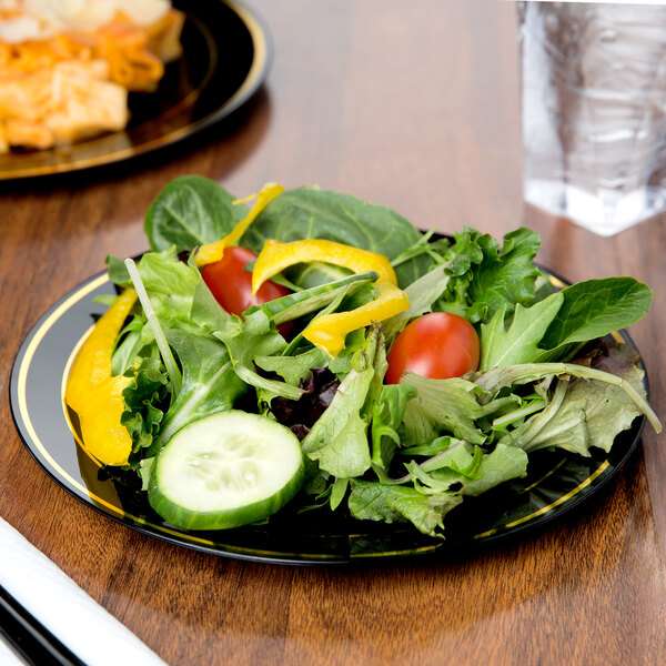 Made of heavy weight plastic, this strong and sturdy Fineline Silver Splendor 507-BKG 7" black plastic plate is perfect for wedding receptions and luncheons. It's great for serving appetizers, salads, and desserts, adding style and class to any tabletop. Plus, it's embellished with two golden bands to give it a distinct style that combines the convenience of plastic with the elegant appeal of china.