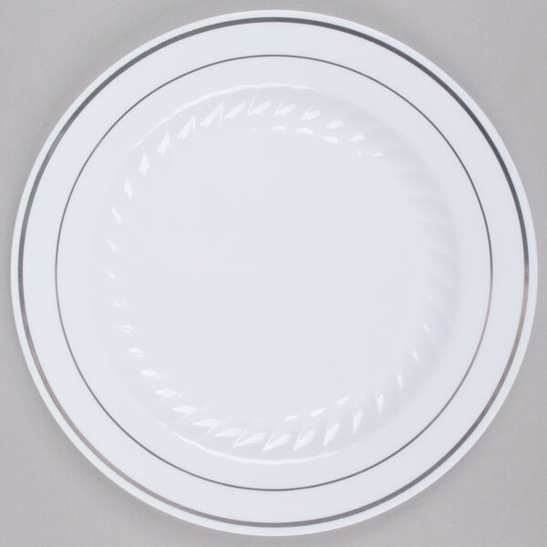 Made of heavy weight plastic, this strong and sturdy Fineline Silver Splendor 507-WH 7" white plastic plate is perfect for wedding receptions and luncheons. It's great for serving appetizers, salads, and desserts, adding style and class to any tabletop. Plus, it's embellished with two silver bands to give it a distinct style that combines the convenience of plastic with the elegant appeal of china.