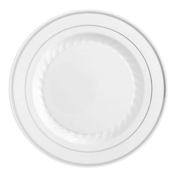 Made of heavy weight plastic, this strong and sturdy Fineline Silver Splendor 509-WH 9" white plastic plate is perfect for wedding receptions and luncheons. It's great for serving salads and entrees, adding style and class to any tabletop. Plus, it's embellished with two silver bands to give it a distinct style that combines the convenience of plastic with the elegant appeal of china.