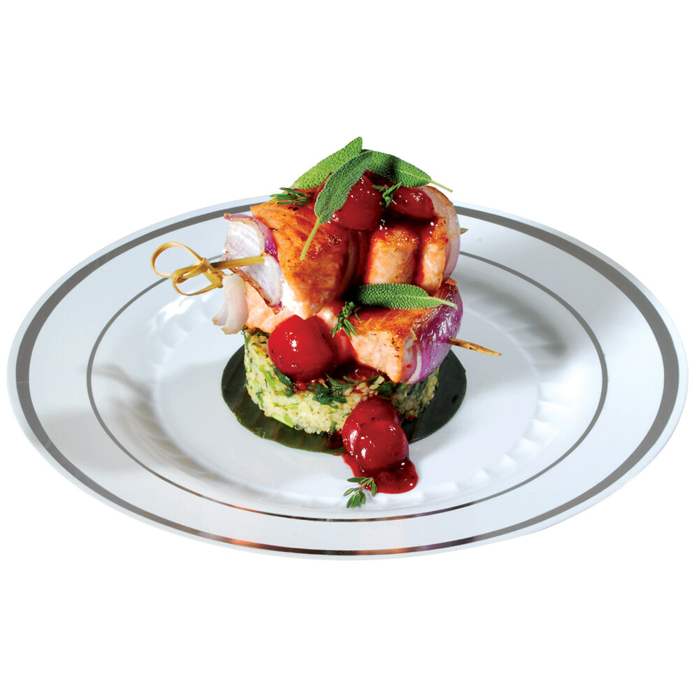 Two metallic silver bands trace the outermost rim of each plate for an elegant appearance, no matter the occasion. At the same time, the bright white surface of the plate provides a pleasing contrast to the silver accent bands, ensuring a professional presentation, fit for any event.