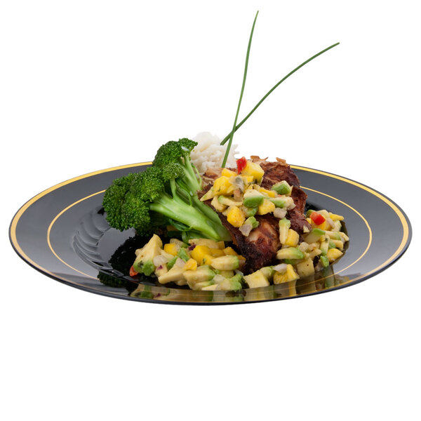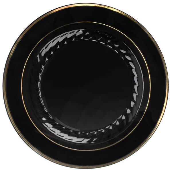 Made of heavy weight plastic, this strong and sturdy Fineline Silver Splendor 510-BKG 10" black plastic plate is perfect for wedding receptions and luncheons. It's great for serving salads and entrees, adding style and class to any tabletop. Plus, it's embellished with two gold bands to give it a distinct style that combines the convenience of plastic with the elegant appeal of china.
