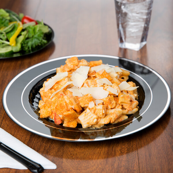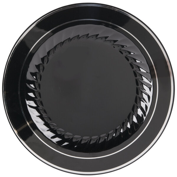 Made of heavy weight plastic, this strong and sturdy Fineline Silver Splendor 510-BKS 10" black plastic plate is perfect for wedding receptions and luncheons. It's great for serving salads and entrees, adding style and class to any tabletop. Plus, it's embellished with two silver bands to give it a distinct style that combines the convenience of plastic with the elegant appeal of china.