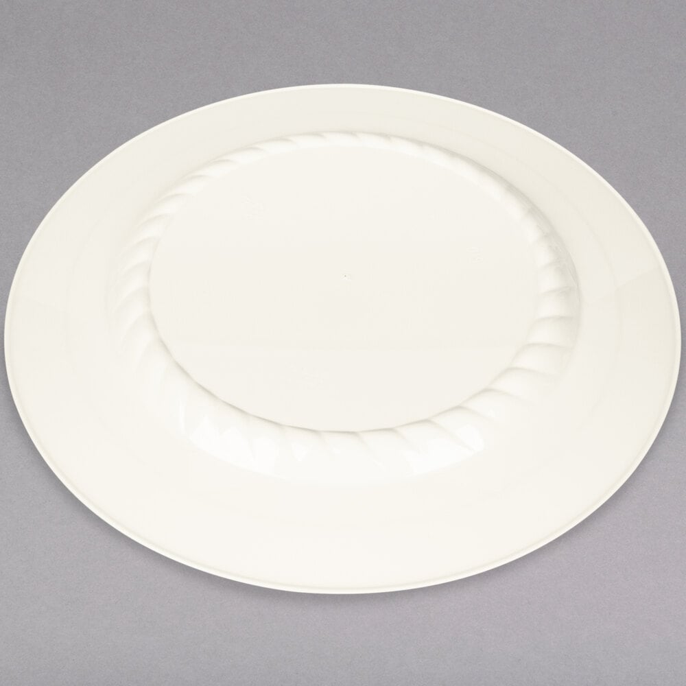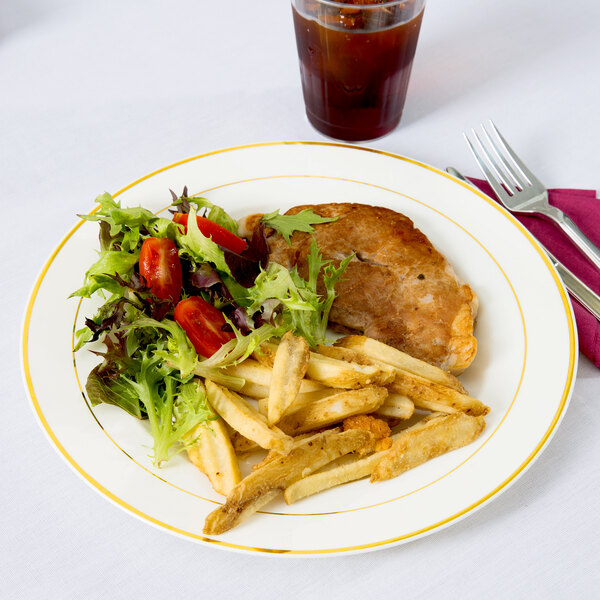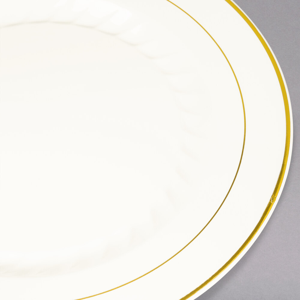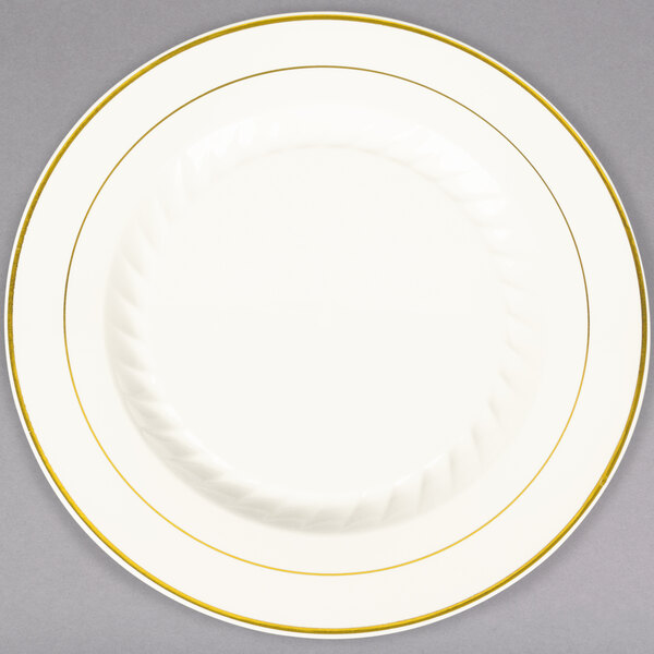 Made of heavy weight plastic, this strong and sturdy Fineline Silver Splendor 510-BO 10" bone / ivory plastic plate is perfect for wedding receptions and luncheons. It's great for serving salads and entrees, adding style and class to any tabletop. Plus, it's embellished with two gold bands to give it a distinct style that combines the convenience of plastic with the elegant appeal of china.