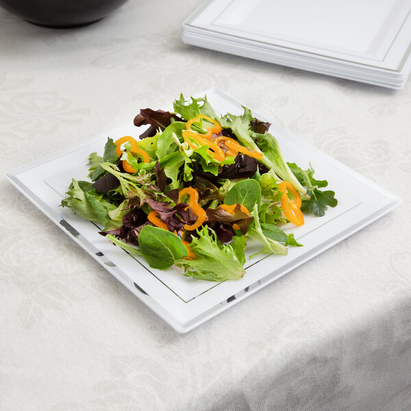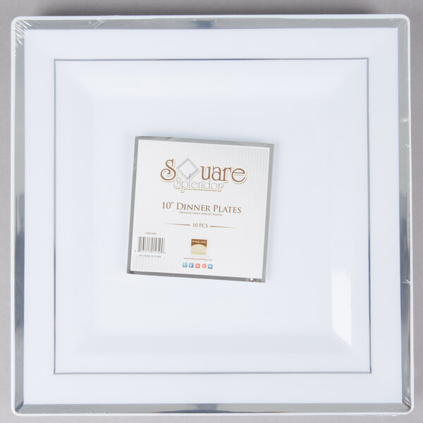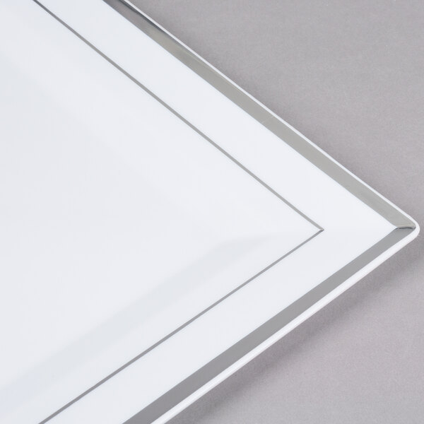 Made of heavy weight plastic, this strong and sturdy Fineline Silver Splendor 5510-WH 10" white plastic squareplate is perfect for wedding receptions and luncheons. It's great for serving salads and entrees, adding style and class to any tabletop. Plus, it's embellished with two silver bands to give it a distinct style that combines the convenience of plastic with the elegant appeal of china.