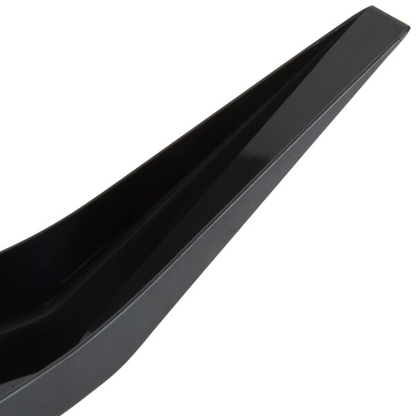 Bring something new to the table with this disposable black plastic serving spoon from the Tiny Temptations collection. The sleek, black color provides the perfect backdrop to present your tiny hors d'oeuvres, small portions of sushi, or delicate desserts at your buffet or catered event. Featuring a totally unique design, this spoon is sure to be a hit with customers and staff alike.