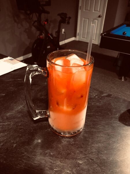 We use this with vodka, worcestershire, and pepper for the best bloody mary over ice. Customers really seem to enjoy it. More flavorful than a regular bloody mary mix.