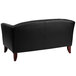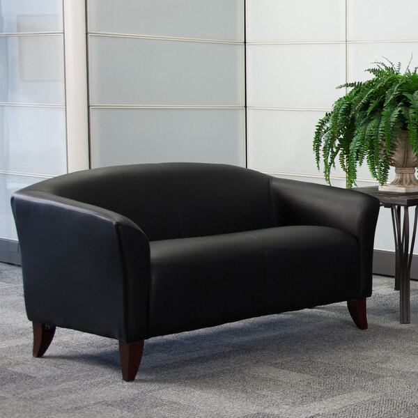 Ensure a comfortable and inviting environment in your office, lounge, or waiting area with this Flash Furniture 111-2-BK-GG Hercules Imperial black leather loveseat with wooden feet! Boasting a rounded back and sloping arms, this loveseat adds a contemporary feel to any room. While the black coloring complements most color schemes, its cherry-stained, bowed wooden feet help tie your room's look together with a warm, professional touch.