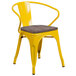 Bring excellent, reliable seating to any urban or modern dining area with the help of this Flash Furniture CH-31270-YL-WD-GG yellow stackable metal chair with arms, vertical slat back, and wood seat. Featuring a textured wood seat, this chair not only provides more comfortable seating than comparable all-metal chairs but also adds a modern look to your seating arrangements. Thanks to its simple, practical design, this chair can also be stacked up to 8 chairs high to maximize storage space. Plus, a curved, vertical slat back provides firm spinal support for additional comfort while enjoying a simple cocktail, delicious entrees, or a small appetizer.