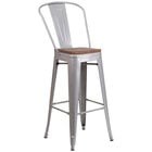 Bring excellent, reliable seating to any urban or modern dining area with the help of this Flash Furniture CH-31320-30GB-BQ-WD-GG 30" black-antique gold stackable metal bar height stool with vertical slat back and wood seat. Featuring a textured wood seat, this stool not only provides more comfortable seating than comparable all-metal stools but also adds a modern look to your seating arrangements. The 30" height is perfect for use at bars or high counters and tables in your bar, bistro, or restaurant that are 40" to 42" high. A convenient footrest built into the frame of the stool helps reduce the pressure on customers' legs and lower backs to promote optimum comfort throughout their visit. Thanks to its simple, practical design, this stool can also be stacked up to 8 stools high to maximize storage space. Plus, a curved, vertical slat back provides firm spinal support for additional comfort while enjoying a simple cocktail, delicious entrees, or a small appetizer.