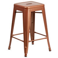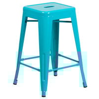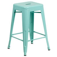 Instantly add an urban look and feel to your bar or tall table tops with this Flash Furniture ET-BT3503-24-GN-GG 24" high distressed green stackable metal counter height stool with drain hole seat! While the raised, drain hole seat is easy to clean and ensures guests are at a comfortable height to enjoy your signature drinks, appetizers, entrees, and desserts, the convenient footrest helps reduce the pressure on customers' legs and lower backs to promote optimum relaxation. Plus, it can be stacked with up to 10 other stools to maximize storage space.