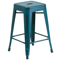 Instantly add an urban look and feel to your bar or tall table tops with this Flash Furniture ET-BT3503-30-KB-GG 30" high distressed kelly blue metal stool! While the raised, drain hole seat is easy to clean and ensures guests are at a comfortable height to enjoy your signature drinks, appetizers, entrees, and desserts, the convenient footrest helps reduce the pressure on customers' legs and lower backs to promote optimum relaxation.