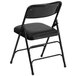 Offer comfortable temporary seating that is both durable and convenient for storage by choosing this Flash Furniture HA-MC309AV-BK-GG black metal folding chair! Its 1" padded seat and curved back features a black vinyl upholstered exterior, which is both easy to clean and durable. The 18 gauge steel frame is suitable for outdoor use and features three braces for maximum support, allowing the folding chair to handle a 300 lb. weight capacity. When it's time to put the chair away, its quad hinged design allows for quick and easy folding every time! This chair comes standard with non-marring glides to protect your floors, so whether it's an indoor banquet or an outdoor concert, this versatile folding chair can meet all your demands!