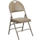 Combine comfort and convenience with this Flash Furniture HA-MC705AV-3-BGE-GG beige metal folding chair, which features an easy-carry handle! Its 1" padded seat and curved back is designed with a beige vinyl upholstered exterior to provide optimal comfort and easy-to-clean maintenance. The 18 gauge steel frame is suitable for outdoor use and features three braces for maximum support. An easy-carry handle at the top of the back rest makes movement easy during set up and tear down of any event. This chair comes standard with non-marring glides to protect your floors, so whether it's an indoor banquet or an outdoor concert, this versatile folding chair can meet all your demands!