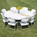 If your party facility, social club, or catering company is looking for new tables, the Flash Furniture RB-72R-GG 72" round granite white plastic folding table is the perfect choice. You can use this table at any buffet, school function, or office break room, making it a versatile option for any business. The 1 3/4" thick tabletop is also made of stain- and impact-resistant plastic for easy cleanup. The 992 lb. capacity means it can support even your heaviest chafer dishes or glass pitchers. Ultimately, this folding table is lighter, more durable, stronger, and easier to clean than standard wooden tables, making it an excellent selection for any business.