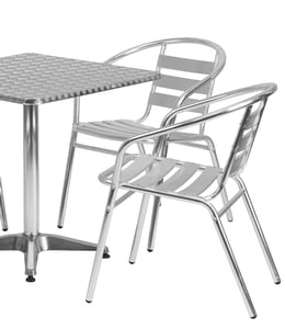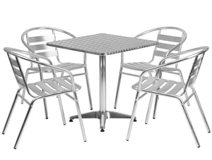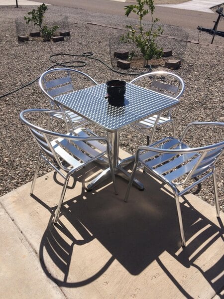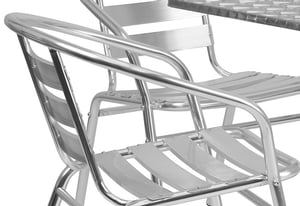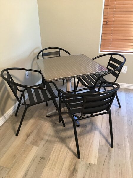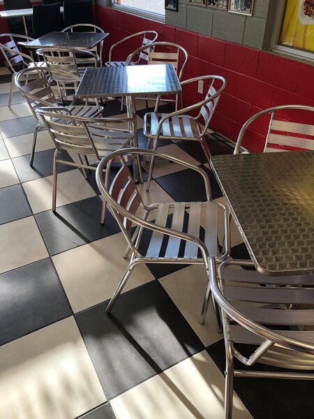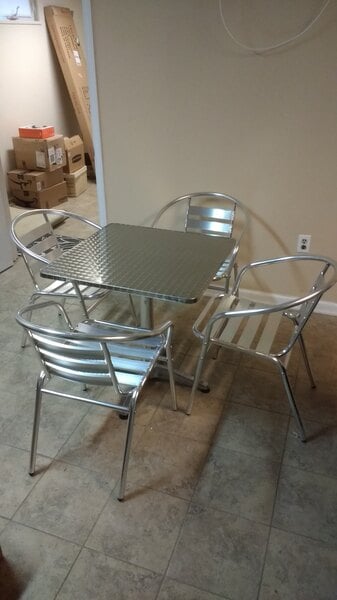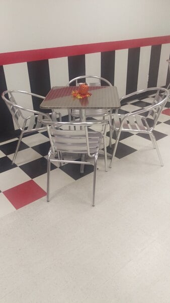 We've had these in our ice cream shop for a year and I'm sad to say, I don't recommend them. They look great, but that's where it ends. They are hard to keep shiny clean, ie they smear when you wipe the table tops. They never look clean, always smeary, no matter what you clean them with. The chairs tip over forward very easily, children have had LOTS of falls out of them. The chair seats have grooves in them which make them hard to clean. The tables, some of them wobble no matter how you try to adjust them. And the chairs are not comfortable. Not at all. I'm here a year later ordering all new tables and chairs. Please consider other table sets. Seeing kids fall over while trying to get into these chairs is frightening to say the least.
