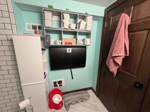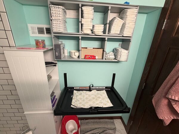 This is the perfect slim line, no fuss, changer for behind my small, bathroom door, for my small in home daycare. Keeps the smelly poos by bathroom fan! Easy to install, took about an hour or less to install. Hit studs perfectly.