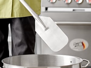 The blade's straight edge design makes it easy to scrape product while its handle is long enough to reach the bottom of large stew pots to prevent food from sticking and burning.