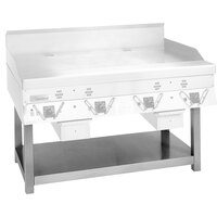 Its 1" thick griddle plate ensures even heating and heat retention, and each thermostatic control has its own on/off switch to help you conserve energy during off-peak times. Additionally, the included sidesplashes, 8" backsplash, and bottom-mounted grease drawers are made of stainless steel, making cleanup simple when finished, while four 6" legs facilitate easy under-griddle access.