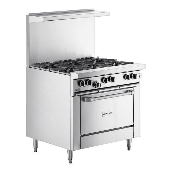 A stainless steel exterior and 21" high backsplash make the Garland G36-6C liquid propane range durable, attractive, and easy to clean. The oven has a porcelainized interior finish for better heat retention and easier cleanup. It requires a 120V electrical connection.
