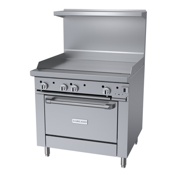 The 36" wide Garland G36-G36C liquid propane griddle top range with convection oven comes packed with features that enhance its convenience and usability. Its 36" griddle top boasts a cast iron 18,000 BTU burner every 12" (36,000 BTU total). It heats evenly thanks to its 5/8" thick griddle plate. The convection oven base is designed for even baking and high performance and boasts three adjustable oven racks.