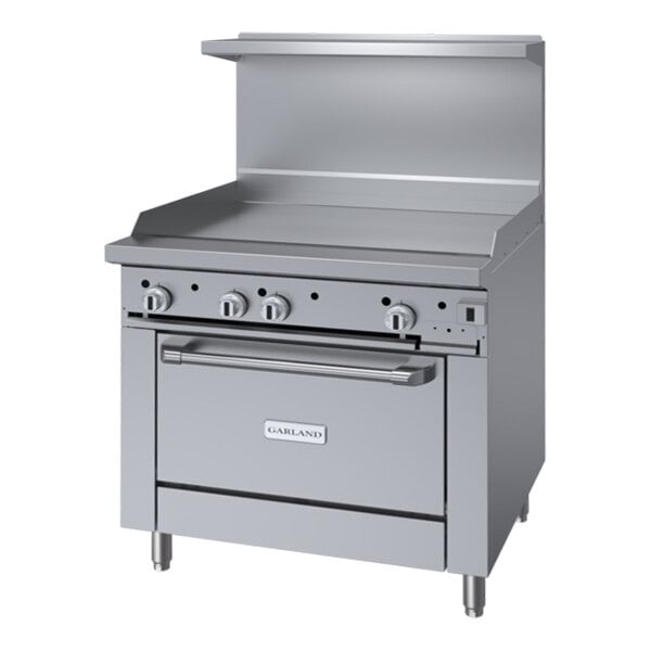 The 36" wide Garland G36-G36C natural gas griddle top range with convection oven comes packed with features that enhance its convenience and usability. Its 36" griddle top boasts a cast iron 18,000 BTU burner every 12" (36,000 BTU total). It heats evenly thanks to its 5/8" thick griddle plate. The convection oven base is designed for even baking and high performance and boasts three adjustable oven racks.