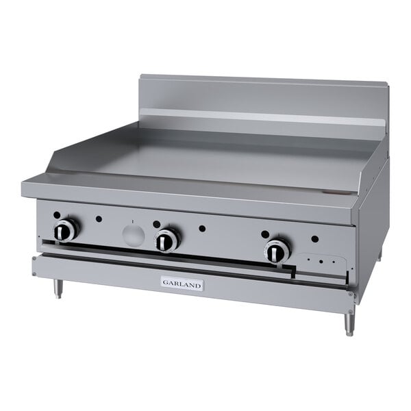 Quickly cook meats, vegetables, and more with this Garland G36-G36T natural gas modular top range with 36" griddle! With a 27 1/4" deep cooking area and 5" deep front countertop ledge, you'll have plenty of space to cook up all of your menu items and keep up with customer demand.