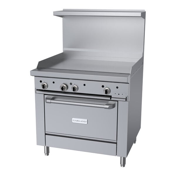 Quickly cook meats, vegetables and more with this Garland G36-G36R liquid propane 36" range with 36" griddle top and standard oven! With a 27" deep cooking area, 21" top shelf, and 5" deep front ledge, this range has the largest usable cooking surface in the industry to provide you with top-of-the-line cooking performance every time!