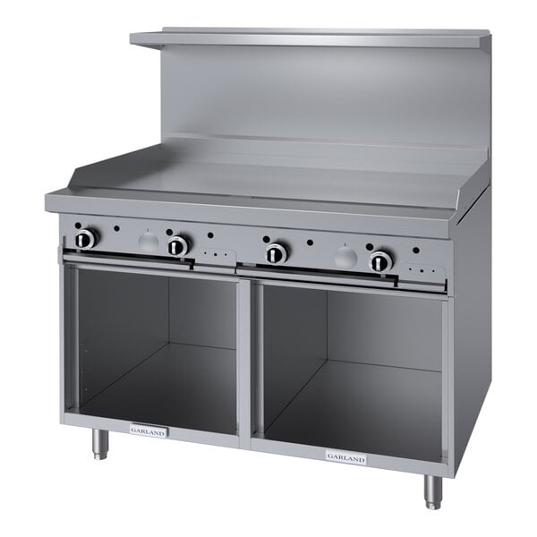 Quickly cook meats, vegetables, and more with this Garland G48-48GSS liquid propane 48" range with 48" griddle top and 2 open storage bases! This model's 48" griddle is made of 5/8" thick steel and features a wide range of temperature settings, delivering 18,000 BTUs of cooking power for every 12" section (72,000 BTU total). The griddle's high splash guards and a 4 1/4" grease trough provide optimum runoff control. With a 27 1/4" deep cooking area, 21" top shelf, and 5" deep front ledge, this range has the largest usable cooking surface in the industry to provide you with top-of-the-line cooking performance every time!