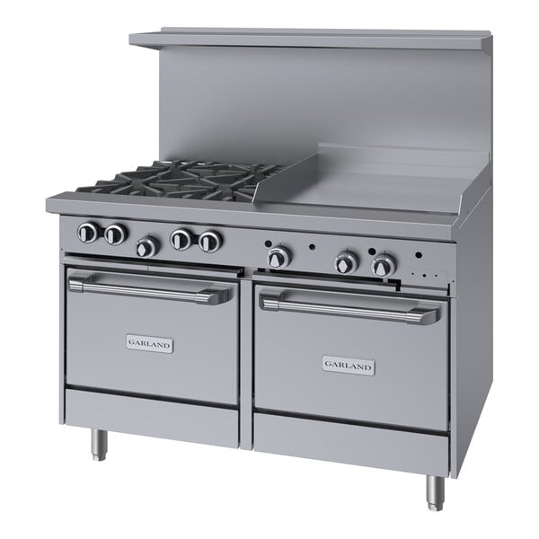 Thanks to its 4 Starfire-Pro 33,000 BTU burners, this Garland G48-4G24LL natural gas 48" range with 24" griddle top and 2 space saver ovens provides you with top-of-the-line cooking performance every time! With a 27 1/4" deep cooking area, 21" top shelf, and 5" deep front ledge, this range has the largest usable cooking surface in the industry. Its cast iron grates allow you to easily slide heavy pots from one section to another, while protected individual burner pilots eliminate spillover outages.