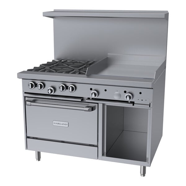 Thanks to its 4 Starfire-Pro 30,000 BTU burners, this Garland G48-4G24RS liquid propane 48" range with 24" griddle top, standard oven, and open storage base provides you with top-of-the-line cooking performance every time! With a 27 1/4" deep cooking area, 21" top shelf, and 5" deep front ledge, this range has the largest usable cooking surface in the industry. Its cast iron grates allow you to easily slide heavy pots from one section to another, while protected individual burner pilots eliminate spillover outages.