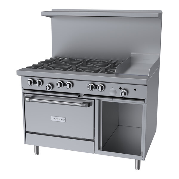 Thanks to its 6 Starfire-Pro 30,000 BTU burners, this Garland G48-6G12RS liquid propane 48" range with 12" griddle top, standard oven and open storage base provides you with top-of-the-line cooking performance every time! With a 27 1/4" deep cooking area, 21" top shelf, and 5" deep front ledge, this range has the largest usable cooking surface in the industry. Its cast iron grates allow you to easily slide heavy pots from one section to another, while protected individual burner pilots eliminate spillover outages.