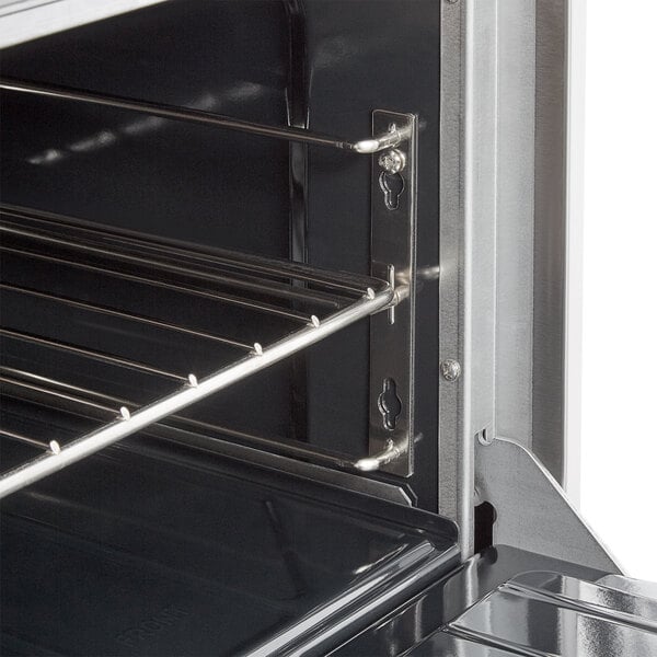 With a large, 27" deep work top surface and a 5" stainless steel plate rail, you'll have plenty of room to work. The porcelain interior makes cleanup a snap, and it fits standard sheet pans in both directions. For increased functionality, there is a small open storage area next to the oven!