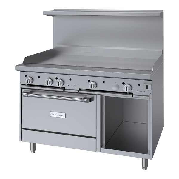 The 48" wide Garland G48-G48CS liquid propane griddle top range with convection oven and storage base comes packed with features that enhance its convenience and usability. Its 48" griddle top boasts a cast iron 18,000 BTU burner every 12" (72,000 BTU total). It heats evenly thanks to its 5/8" thick griddle plate. The convection oven base is designed for even baking and high performance and boasts three adjustable oven racks.