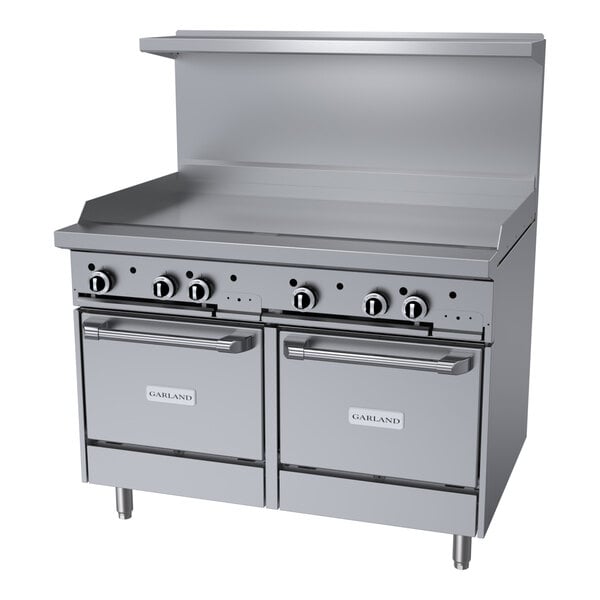 Quickly cook meats, vegetables, and more with this Garland G48-G48LL natural gas 48" range with 48" griddle top and 2 space saver ovens! This model's 48" griddle is made of 5/8" thick steel and features a wide range of temperature settings, delivering 18,000 BTUs of cooking power for every 12" section (72,000 BTU total). The griddle's high splash guards and a 4 1/4" grease trough provide optimum runoff control. With a 27 1/4" deep cooking area, 21" top shelf, and 5" deep front ledge, this range has the largest usable cooking surface in the industry to provide you with top-of-the-line cooking performance every time!